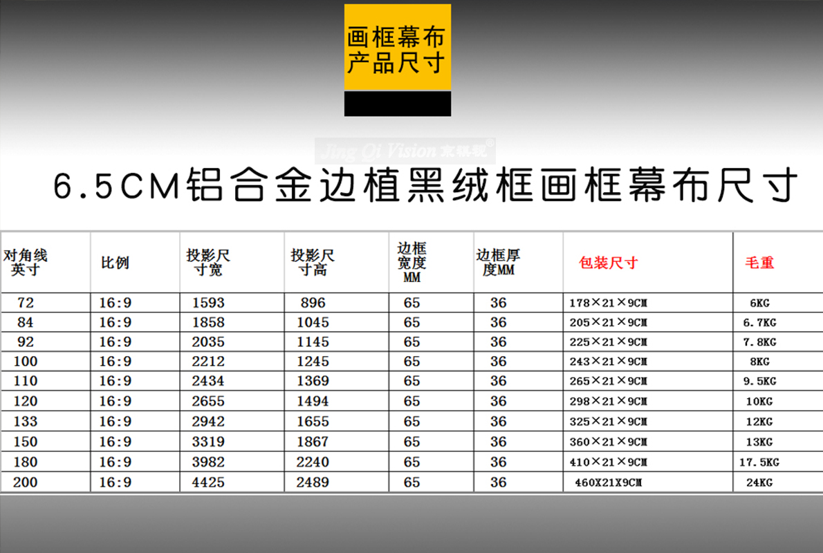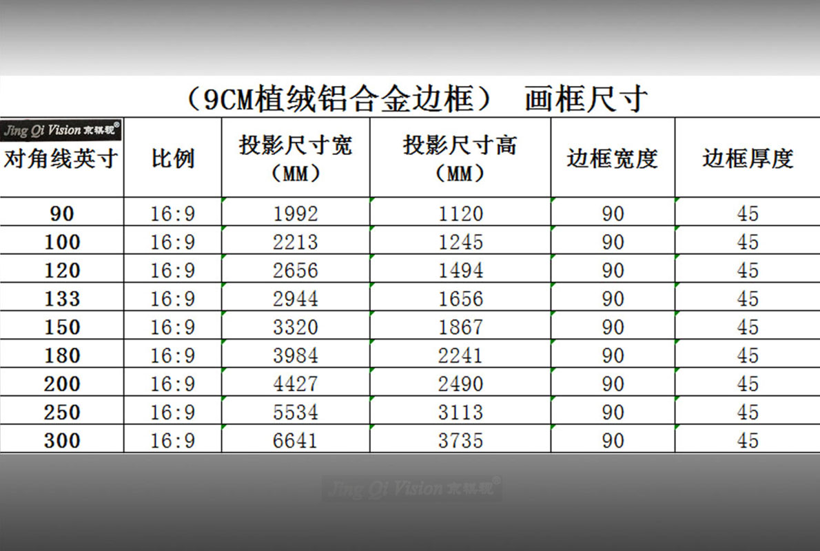 边框设计铝合金6.5厘米 9厘米,减少视觉干扰,让屏幕如画框般置于墙上厚度也仅仅3.6-4.5cm,是家庭影院采用多的选择,幕面更加平整确保各方向受力均匀,有效防止幕布起皱、变形。同时采用铝合金边框、坚固耐用,符合现代人审美观,更适合家居主流。